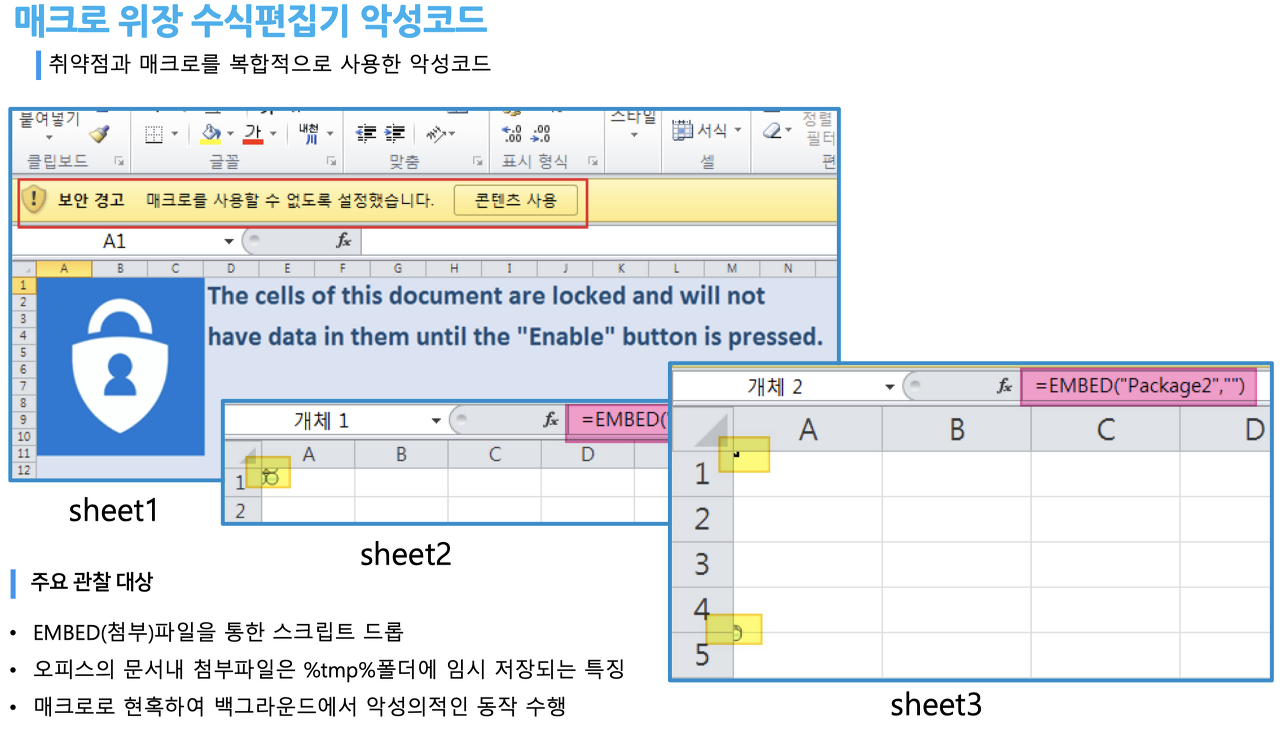 엑셀 문서에는 OLE 객체로 "자바 스크립트"가 포함되어 있으며 Package를 통해 문서 실행시 자동으로 파일 생성