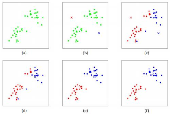 - 분류되지 않은 데이터(a)에서 랜덤하게 초기 좌표 설정(b)