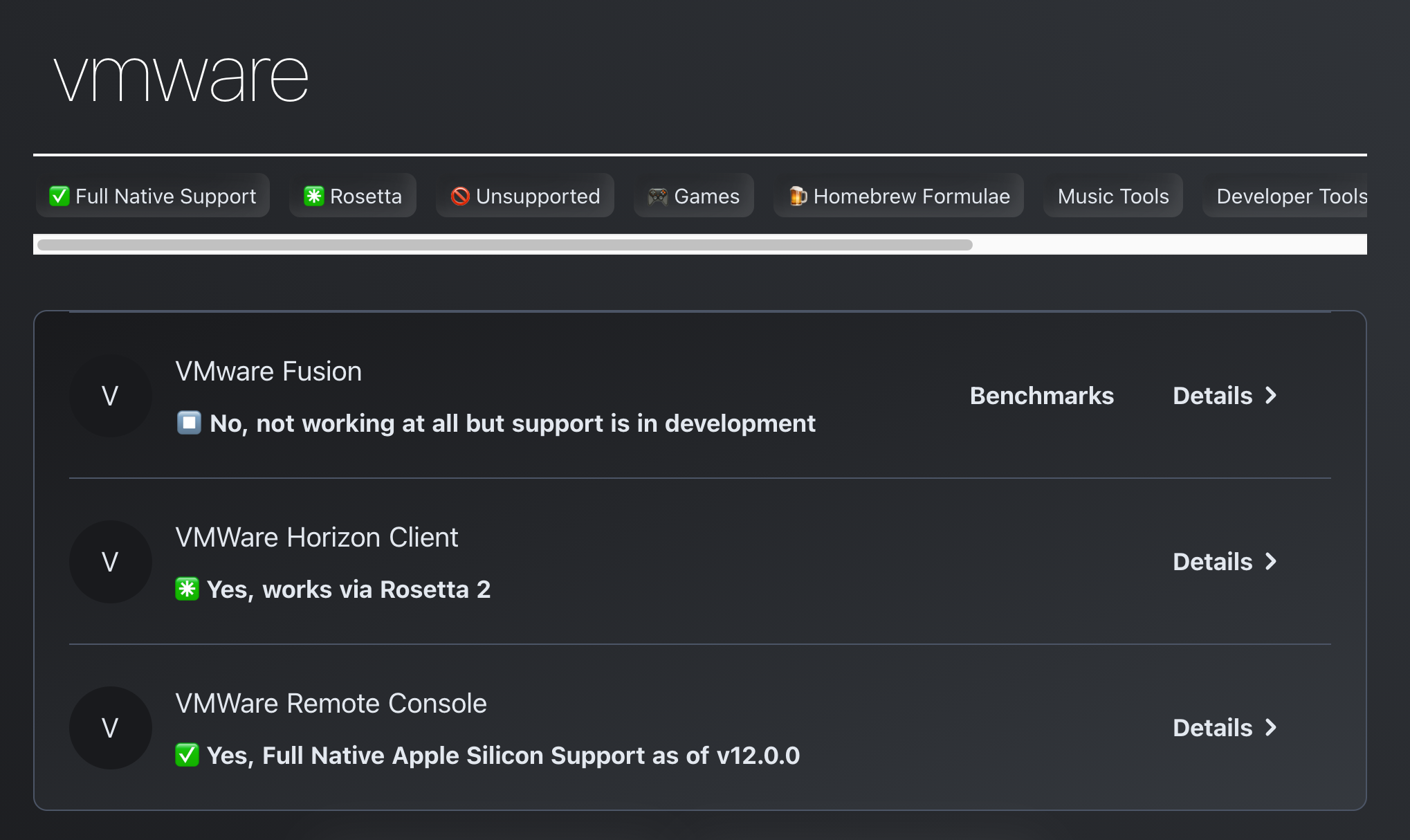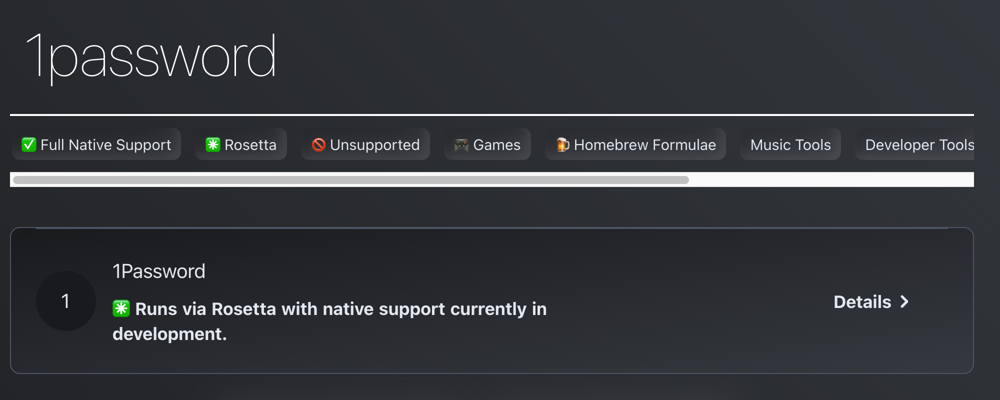 1099 listed, ✅ 60.1% Native, ✳️ 26.8% Rosetta, 🔶 6.6% need info, 🚫 6.5% unsupported.